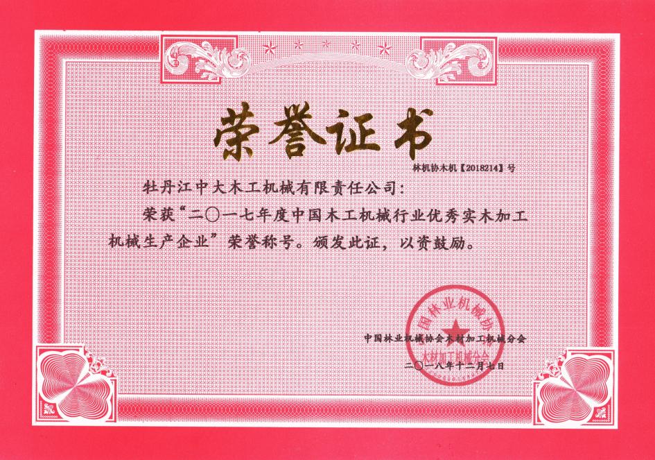 2018年12月7日,在广东顺德由中国林业机械协会举办的颁奖会议上,我公司荣获“中国爱游戏(中国)一站式服务平台行业优秀实木加工机械生产企业”称号。